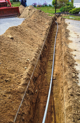 Professional trenching services and installation of electrical-grade conduit for underground mains cabling, complete with proper backfill, warning tape, and compaction.